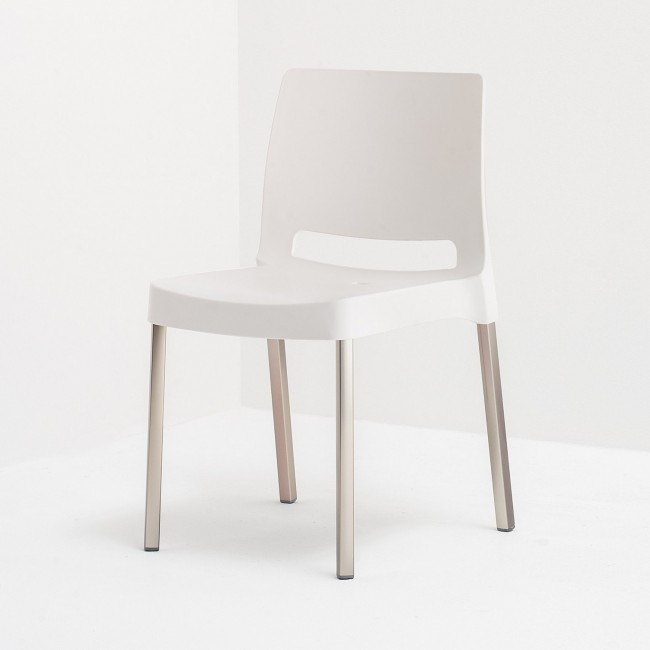From the rational form Joi is supported by aluminum legs that give solidity and character highlighting the ergonomics and the great ease of use. Stackable chair with polypropylene seat and back combined. It can be equipped with a lateral connection hook in nylon to obtain rows of seats. Ideal both indoors and outdoors.